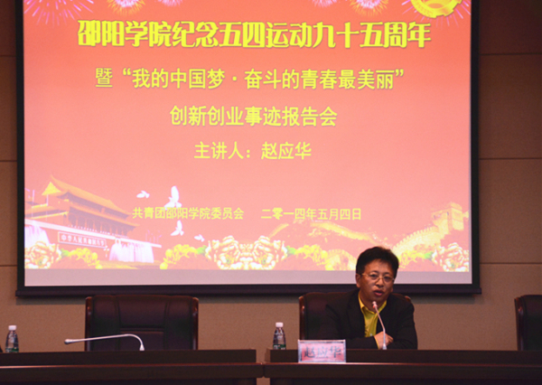 5月4日下午,邵阳学院纪念五四运动95周年暨“我的中国梦——奋斗的青春最美丽”创新创业事迹报告会在七里坪校区办公楼报告厅举行。会议由我校副校长袁曦主持,邵阳公路桥梁建设有限责任公司董事长赵应华、共青团邵阳市委副书记彭洪兵受邀参加。团委、招生就业处、校友联络处等部门负责人,各系(院)团总支书记、学生联合会、学生社团联合会、大学生创业协会及青年学生代表聆听了报告会。
